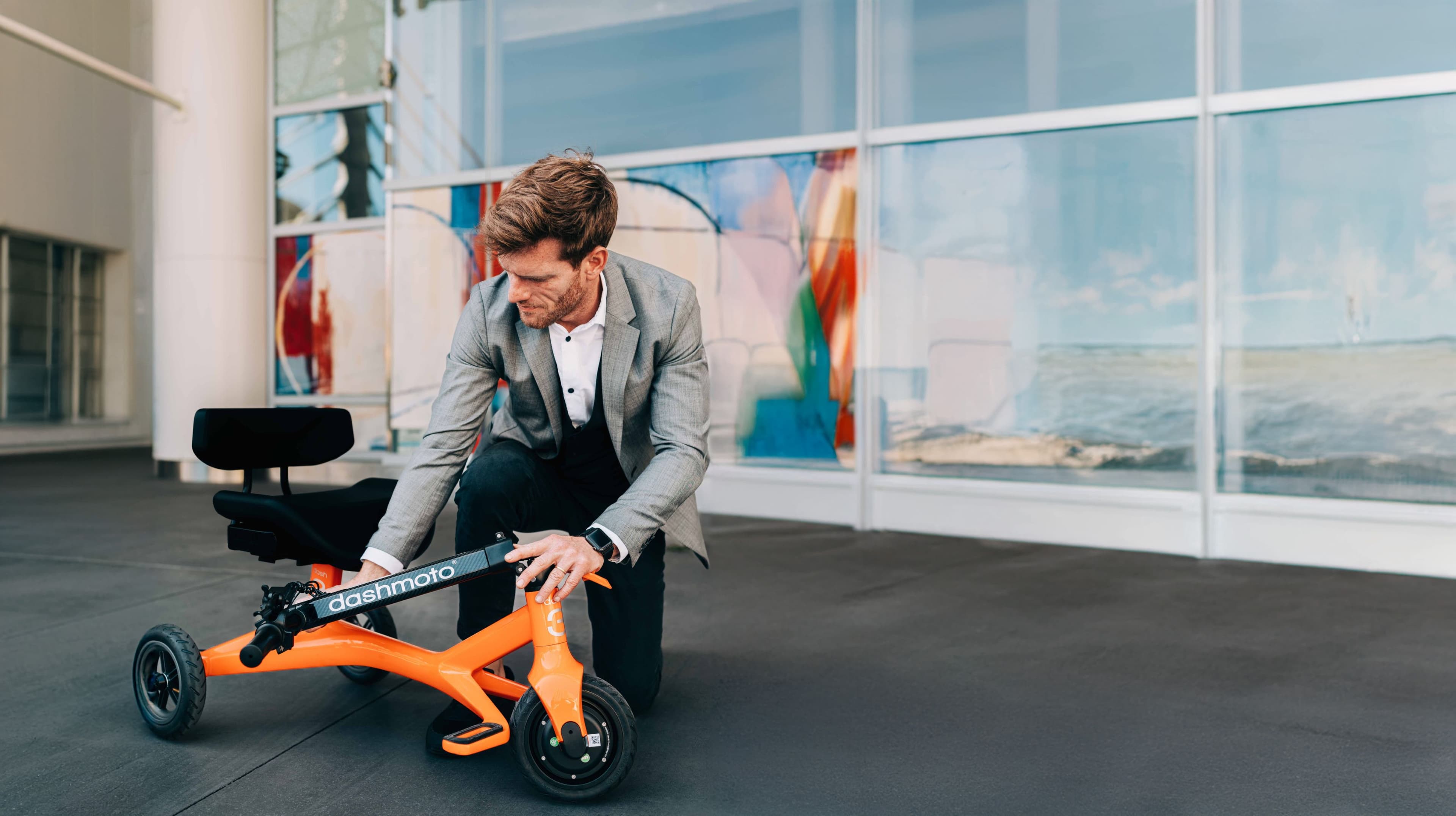 dashmoto®’s front bar folds neatly inward for comfortable seating at a table or café, blending mobility and ease in one simple motion.